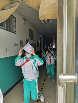 当第二次警报铃声响起时,在老师的指挥下,全体学生安全地撤离到空旷的指定安全集合点上。