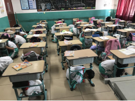 当第一次警报铃声响起时,学生们急忙双手抱头有序地躲进课桌底下避难。