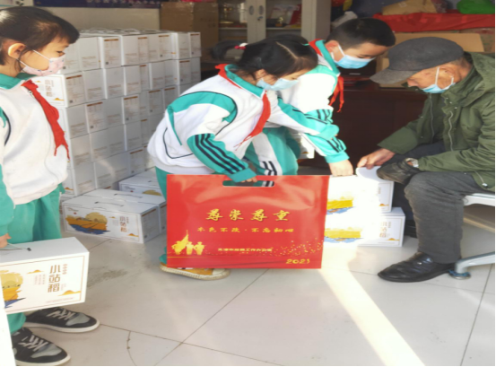 青凝侯中心小学学生代表在为军属发放慰问品